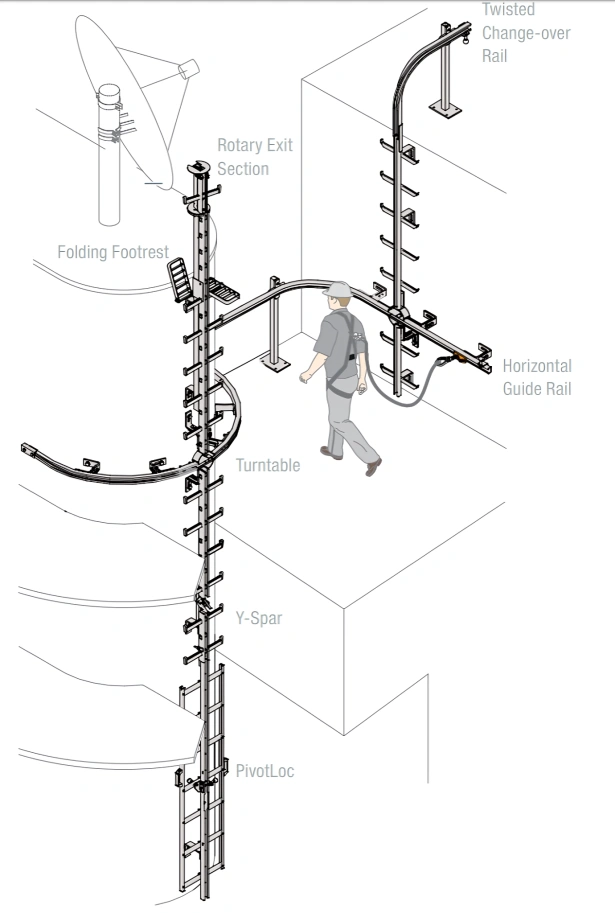 Los accesorios del sistema —como dispositivos de entrada y salida, acceso a techos y sistemas de entrada a espacios confinados— permiten diseñar soluciones que se ajustan a la infraestructura específica del cliente, cumpliendo con las más altas exigencias de seguridad industrial.